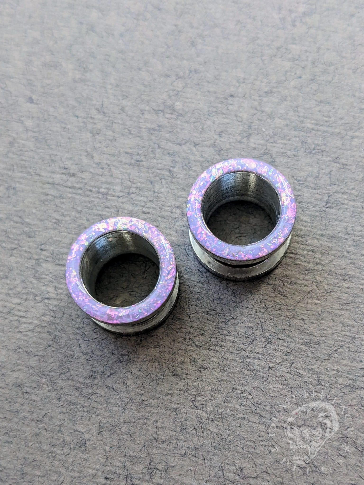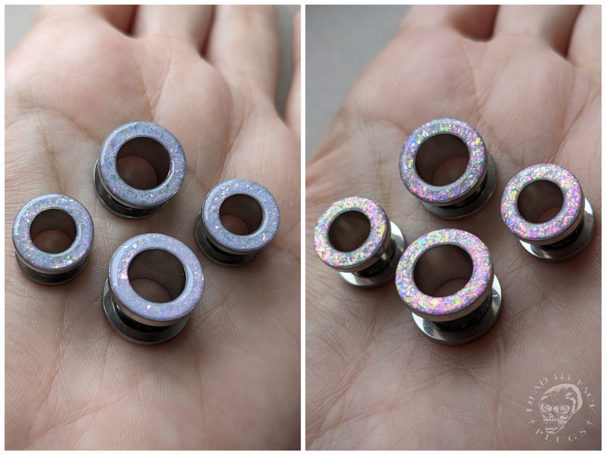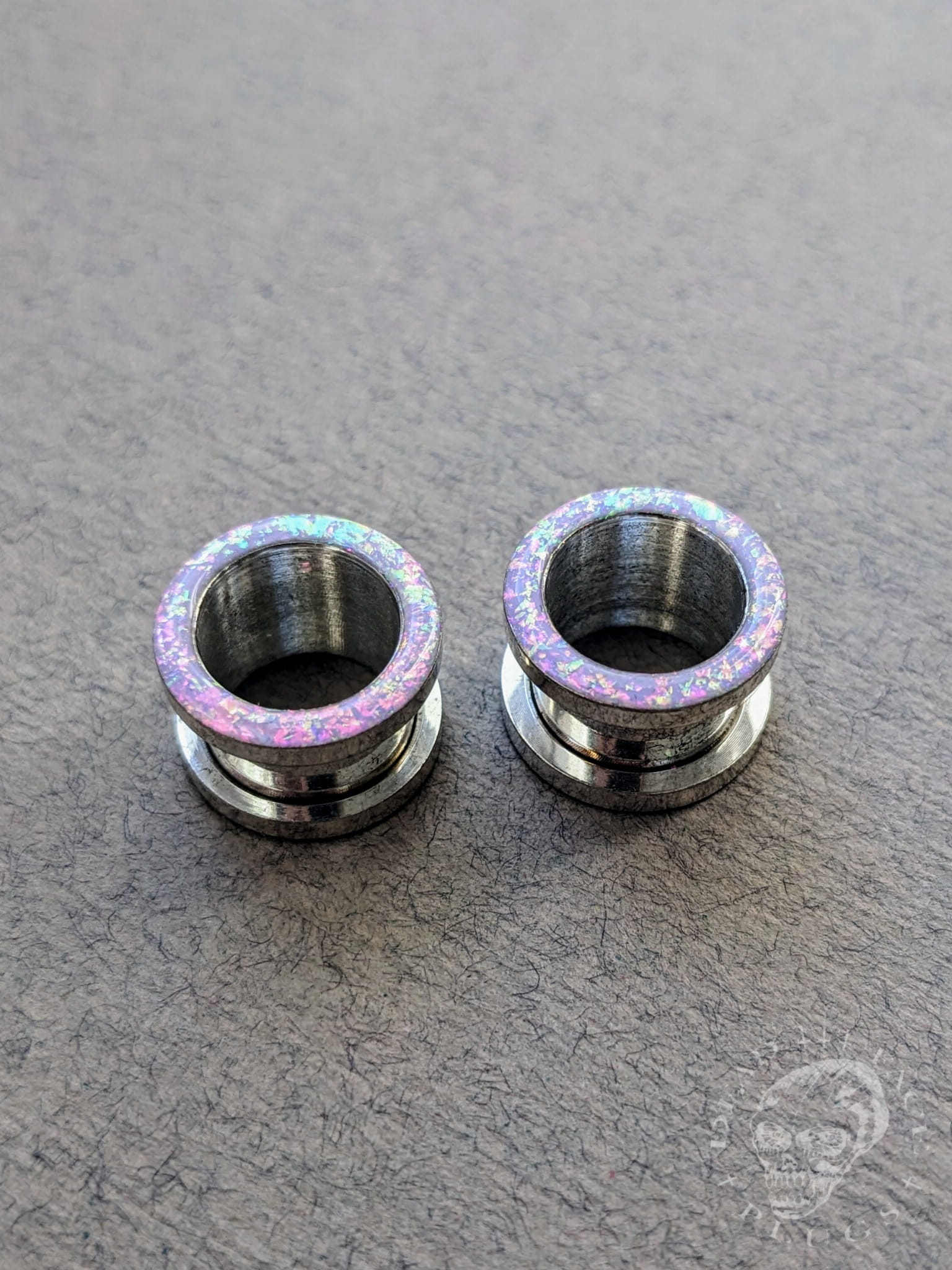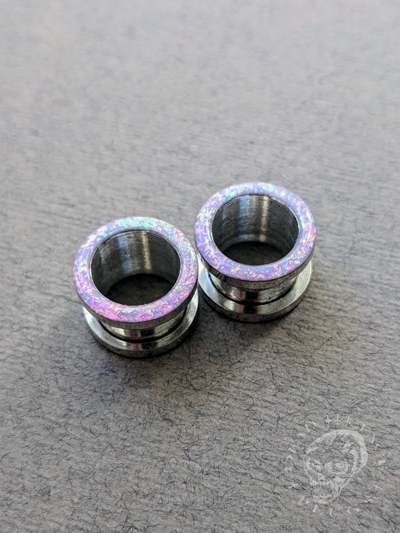 Handmade magical opalescent ear tunnels in surgical steel with a screw-on back, decorated with lilac sparkles shimmering in pink, mint, gold, and green. Every pair is unique and one-of-a-kind.