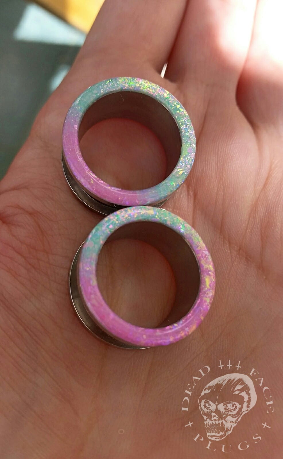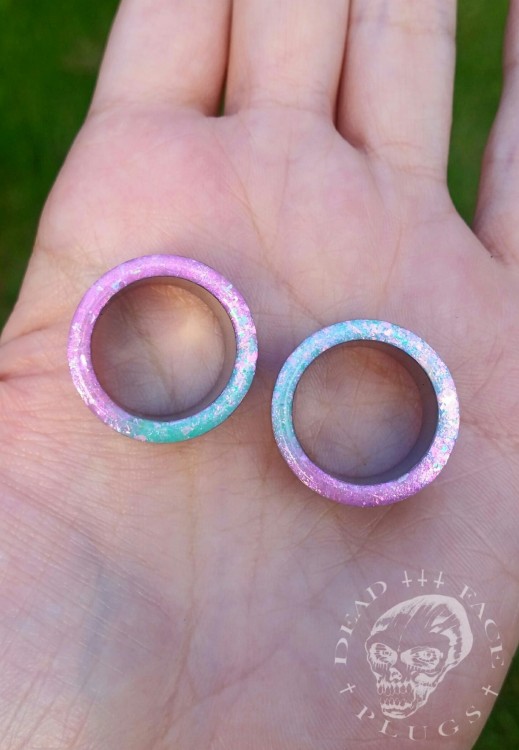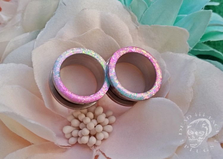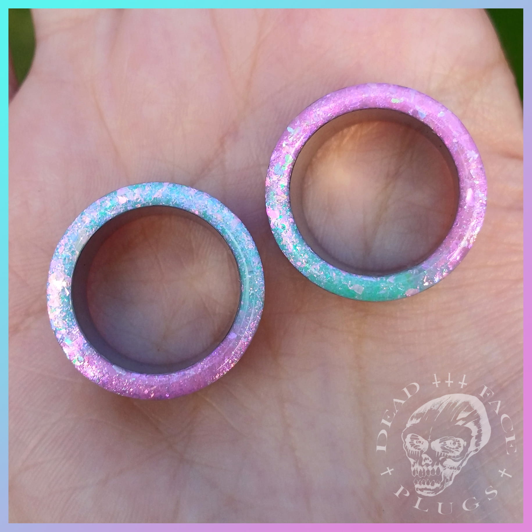 Zdobienie w kolorze mięty i koktajlu z jeżyn z opalizującymi na różowo i zielono płatkami.