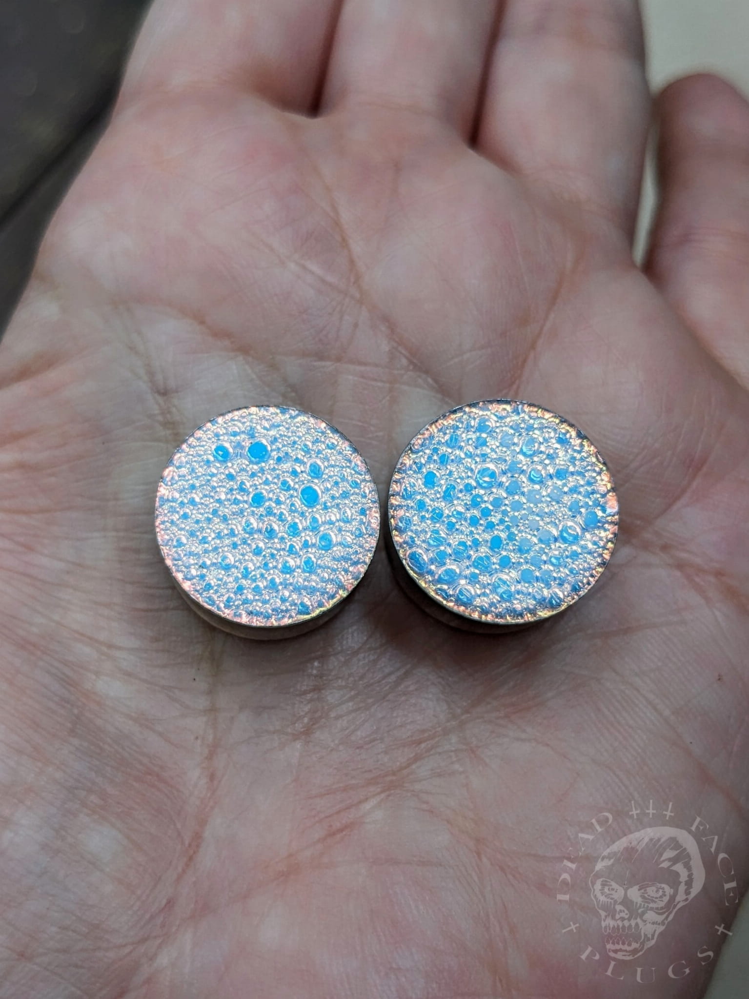 Eleganckie plugi do uszu wykonane na srebrnych stalowych tunelach, mieniące się odcieniami błękitu, złota, miedzi i zieleni przy każdym ruchu. Ich fakturowane wykończenie nadaje im unikatowego i przyciągającego wzrok charakteru.