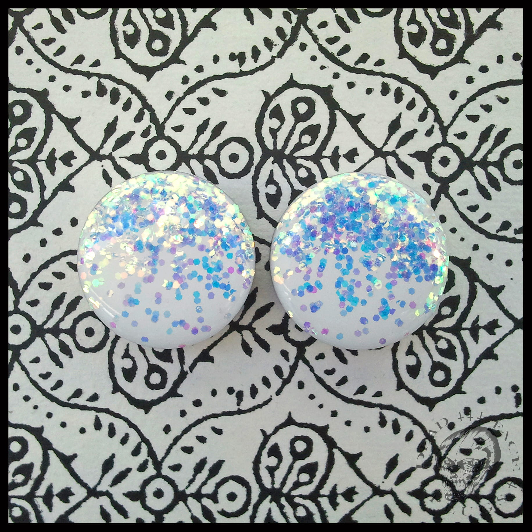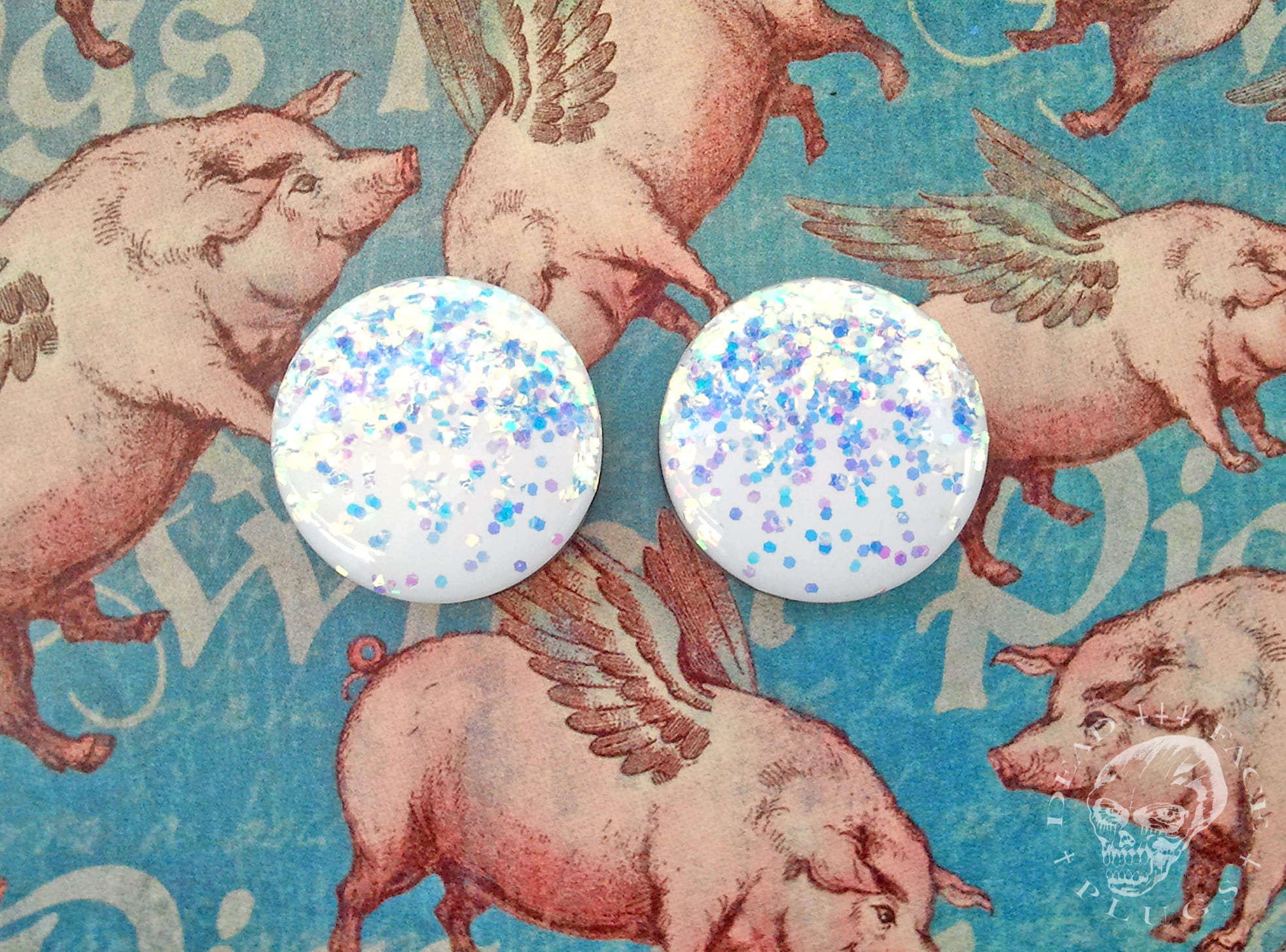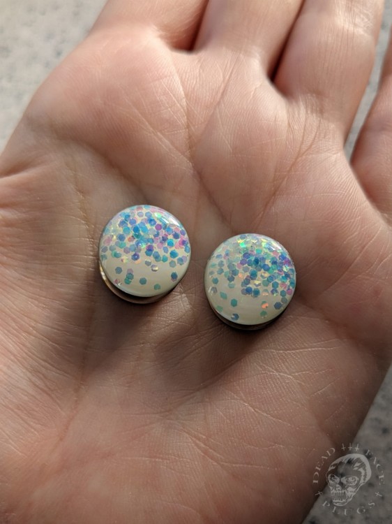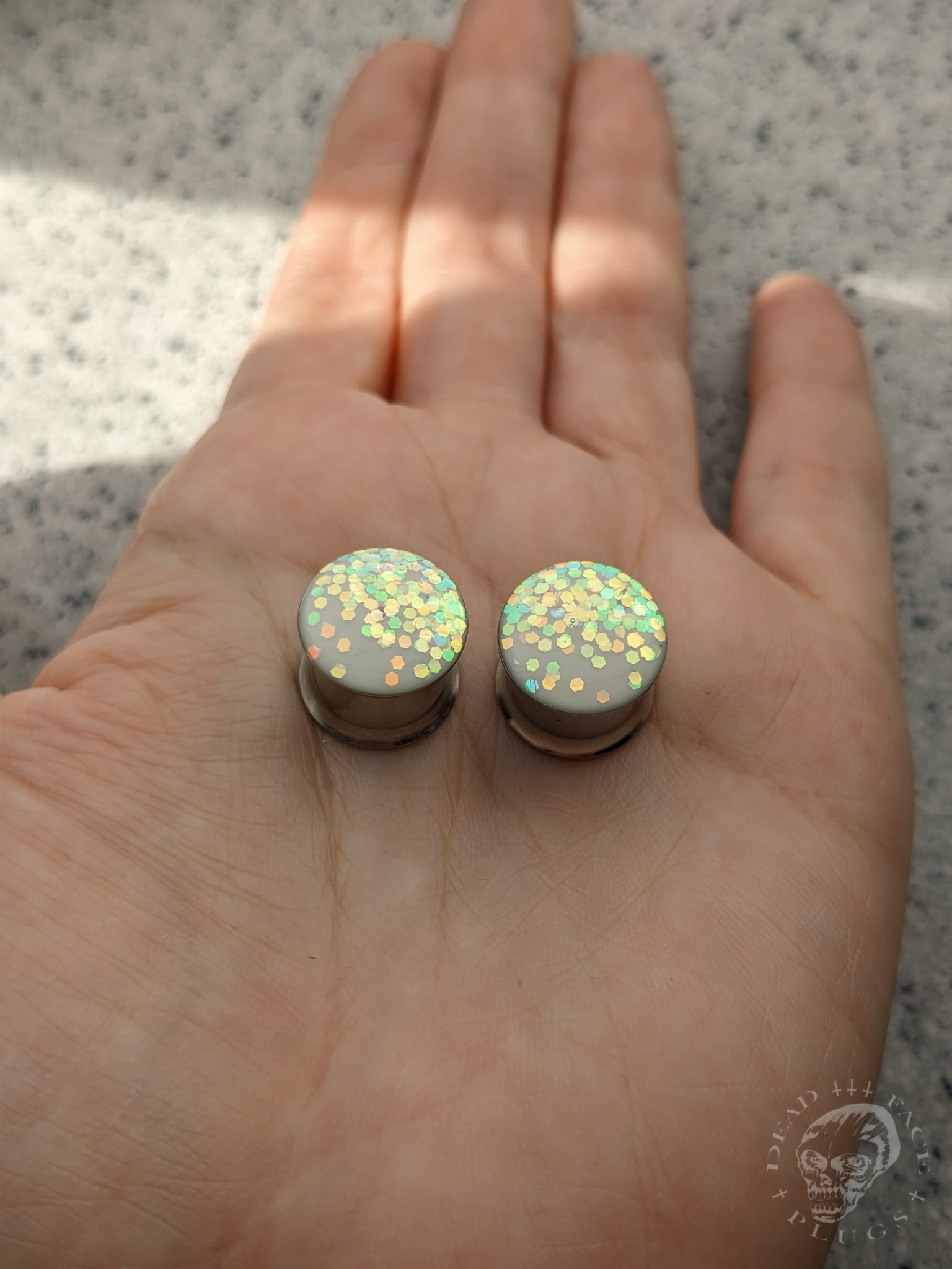 Ozdobione mieniącym się na pastelowo grubym brokatem.