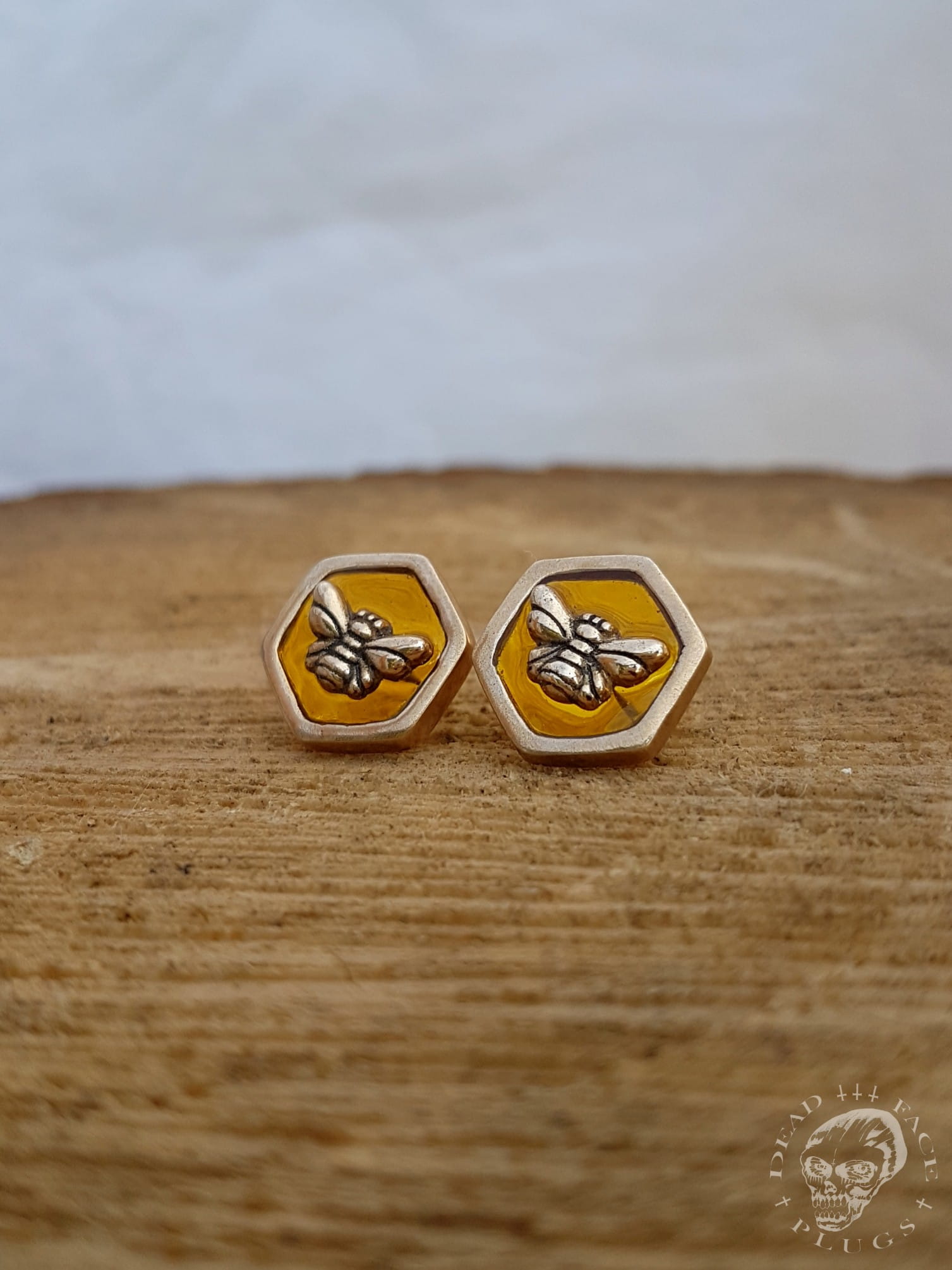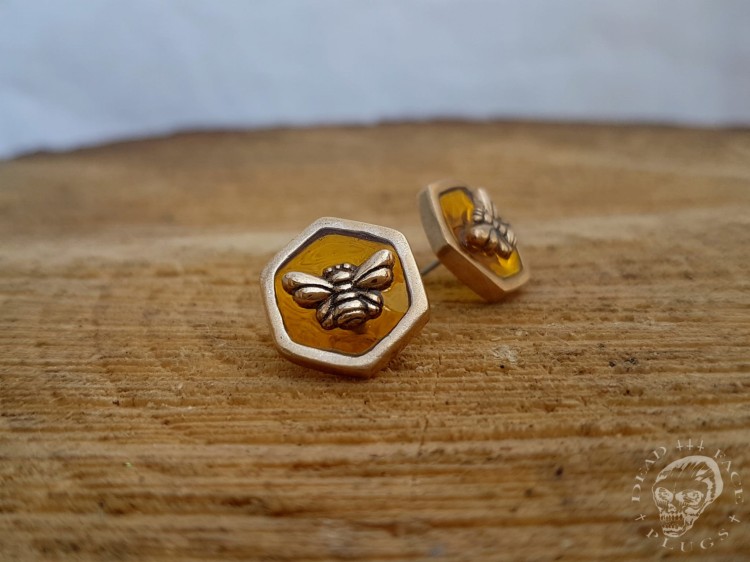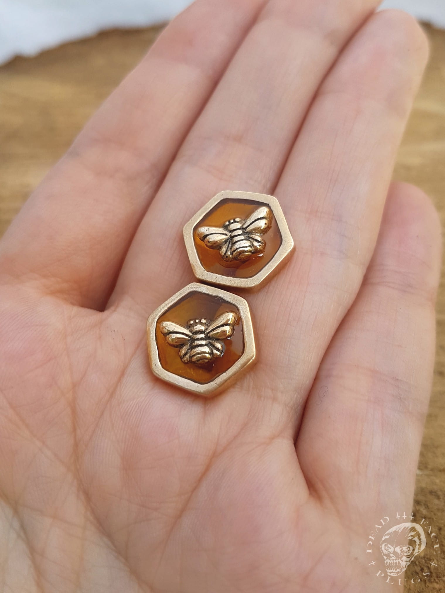 Efektowne miodowe plasterki, na których przysiadła mała pszczoła. Poszczególne elementy wykonane są ręcznie z brązu. Sztyfty i baranki są stalowe.