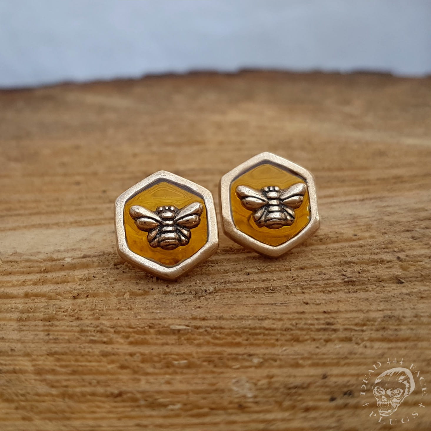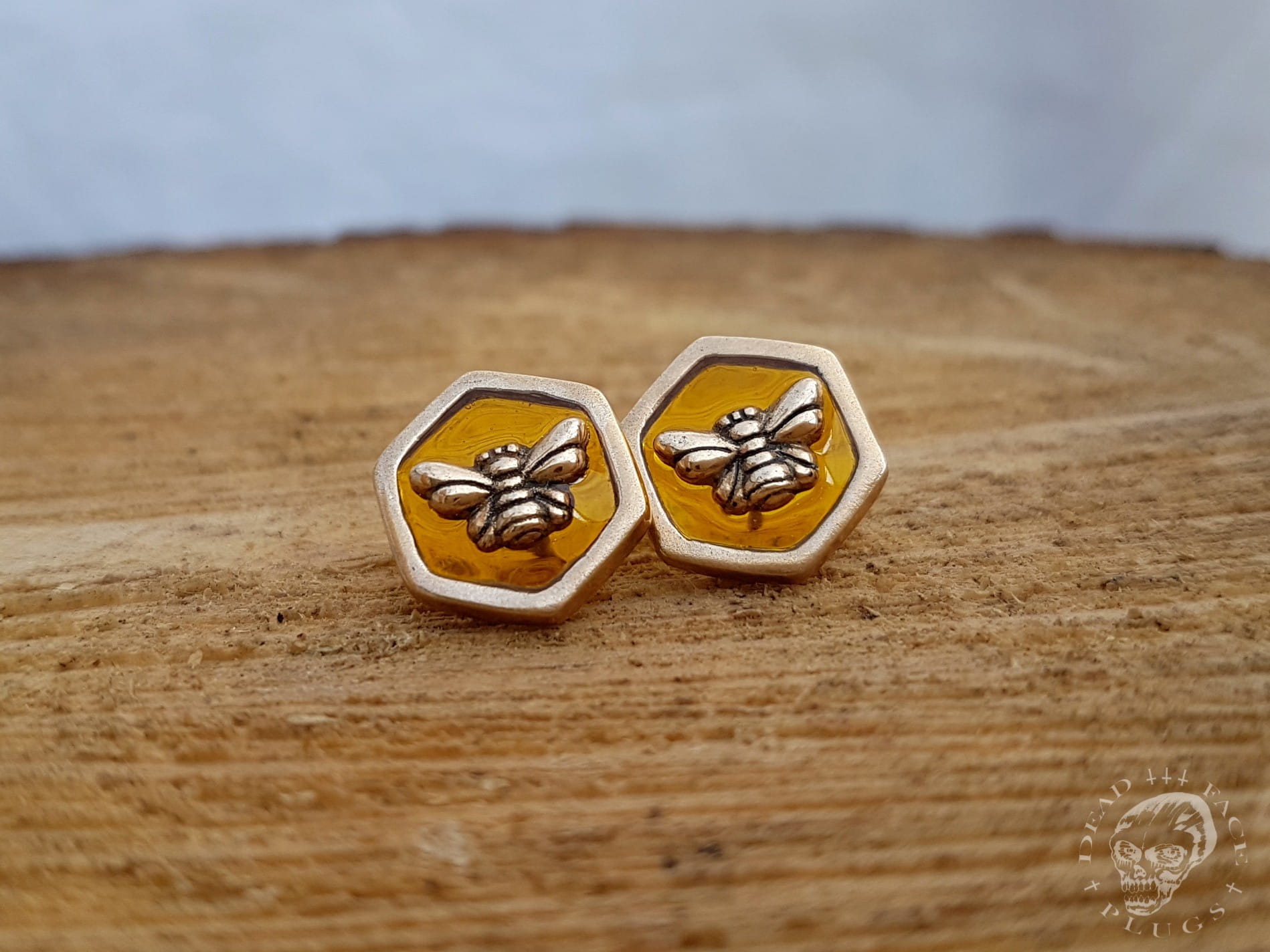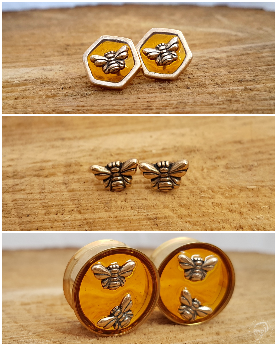 Efektowne miodowe plasterki, na których przysiadła mała pszczoła. Poszczególne elementy wykonane są ręcznie z brązu. Sztyfty i baranki są stalowe.