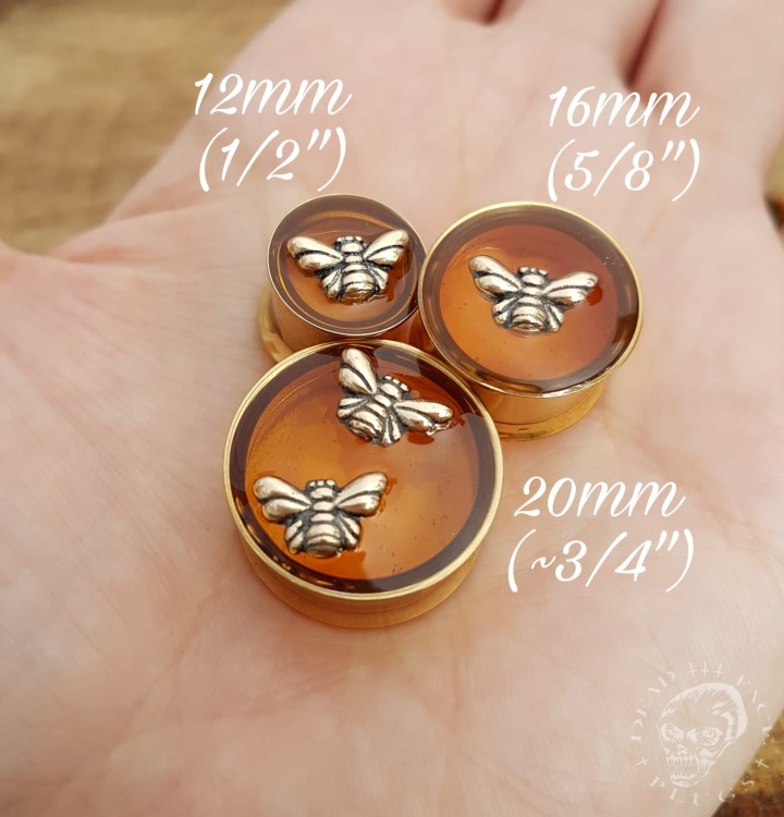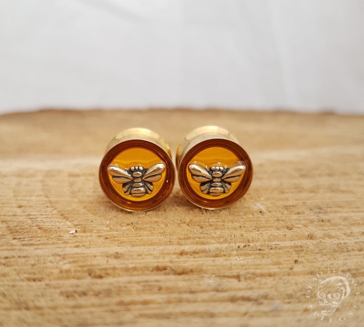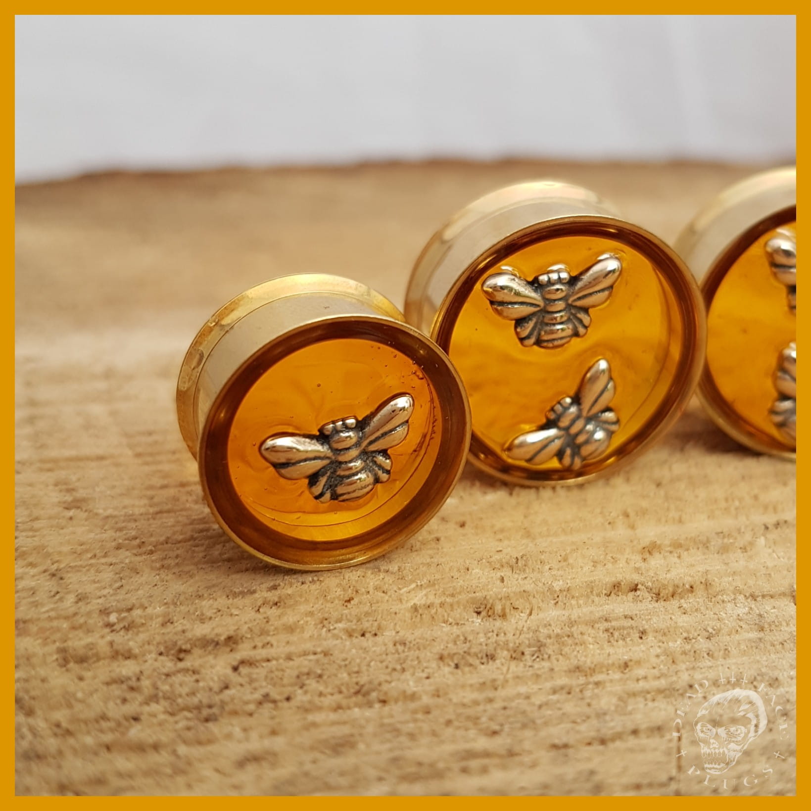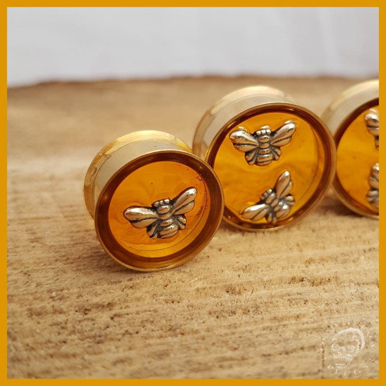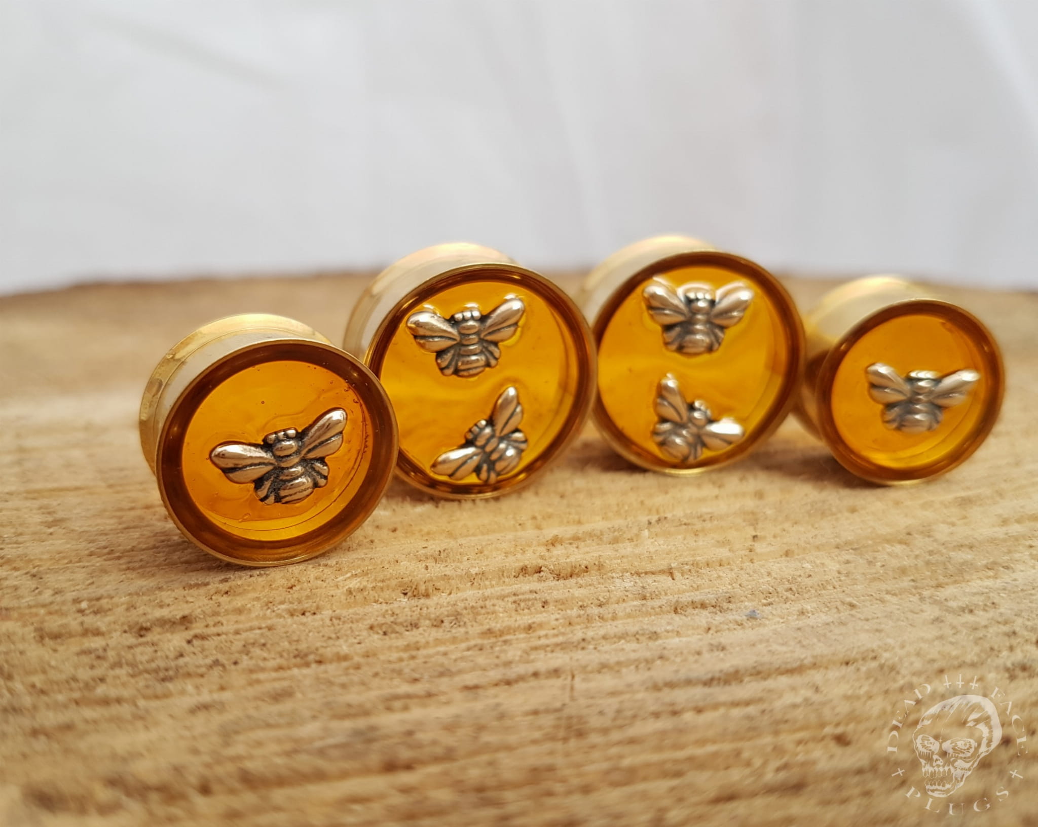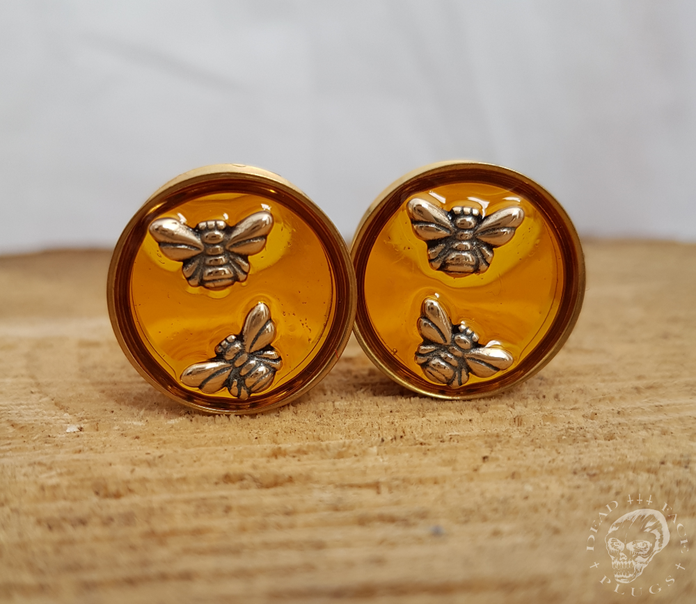 Wypełnione złocistym miodem, na ktorym przysiadły pszczoły.