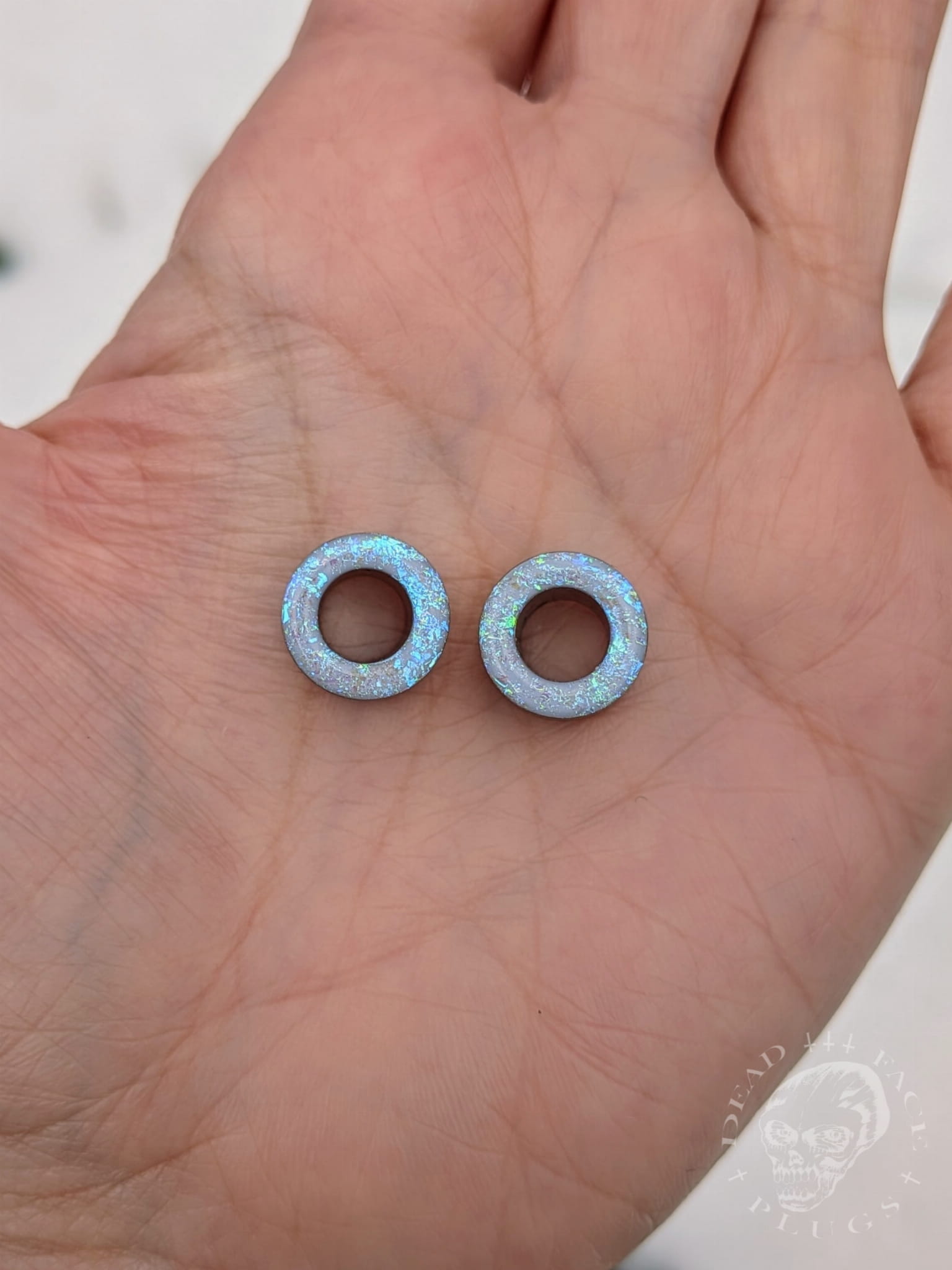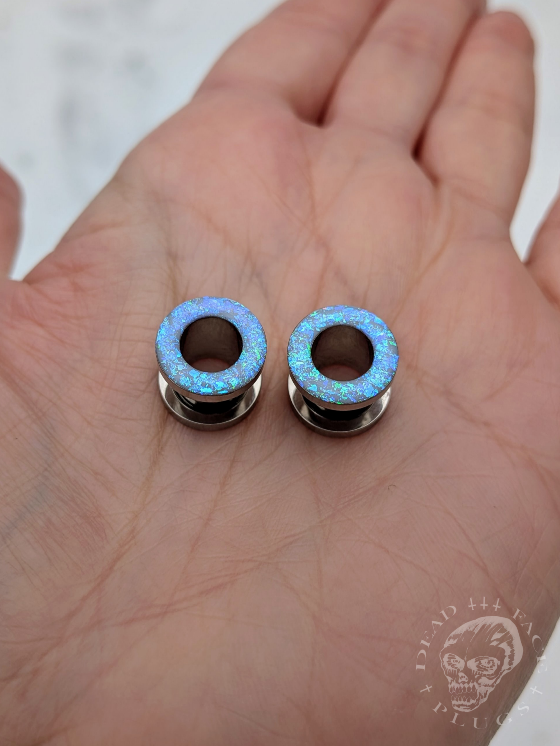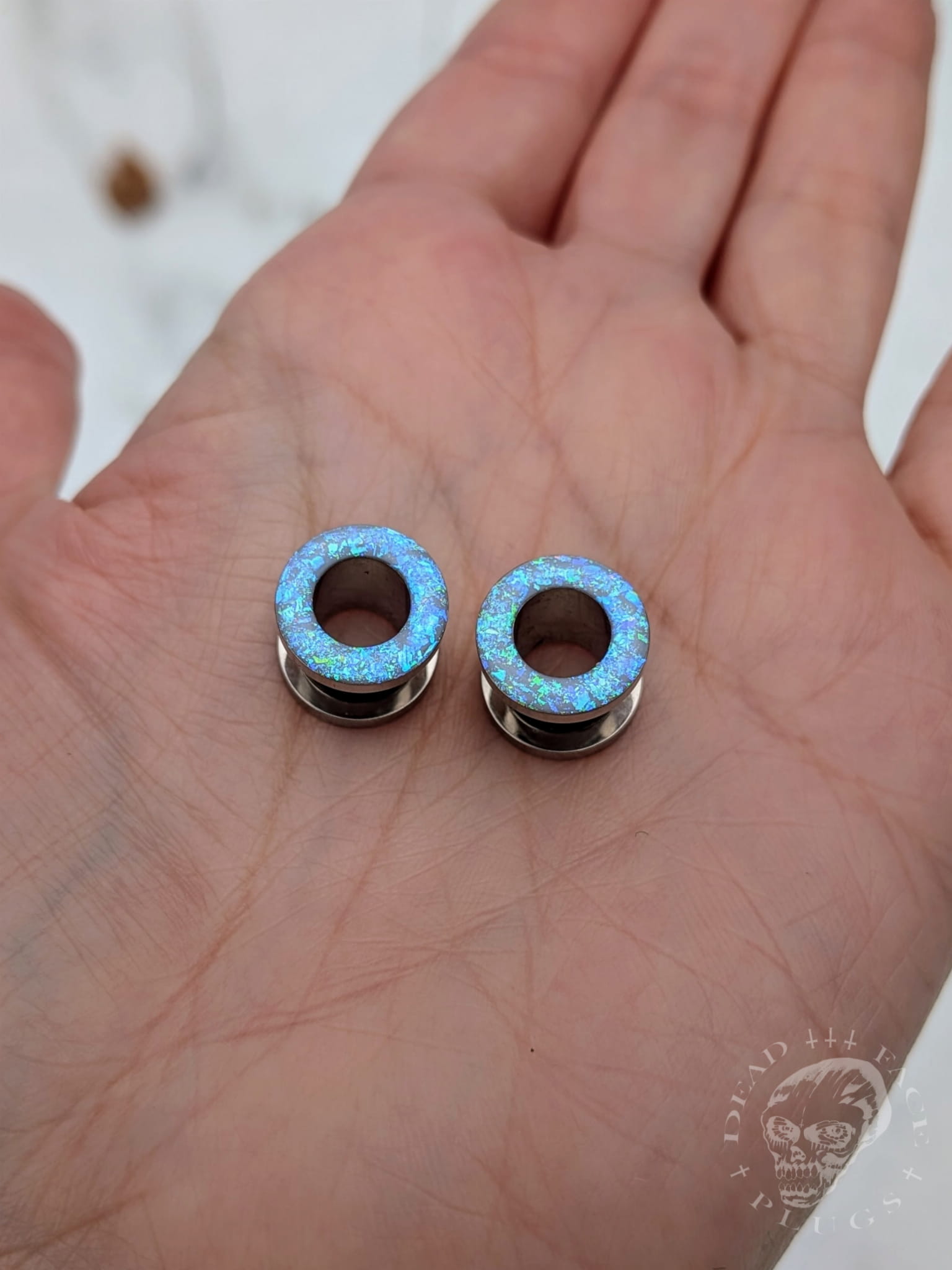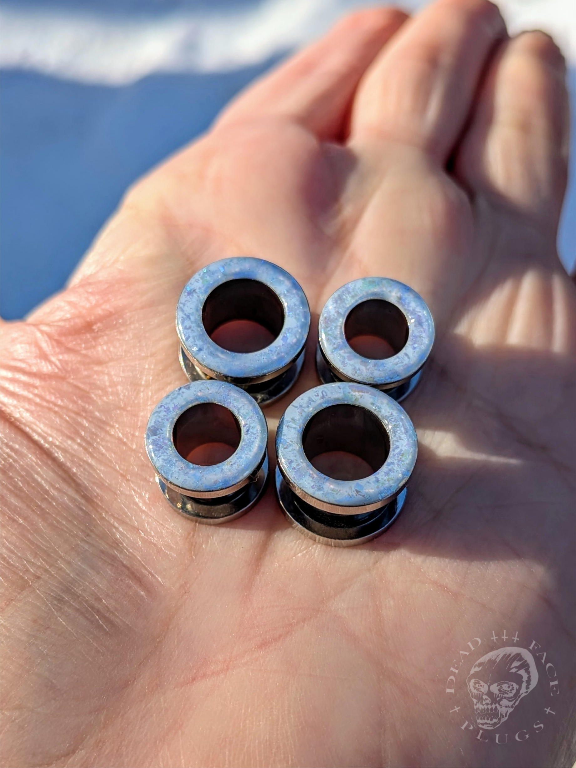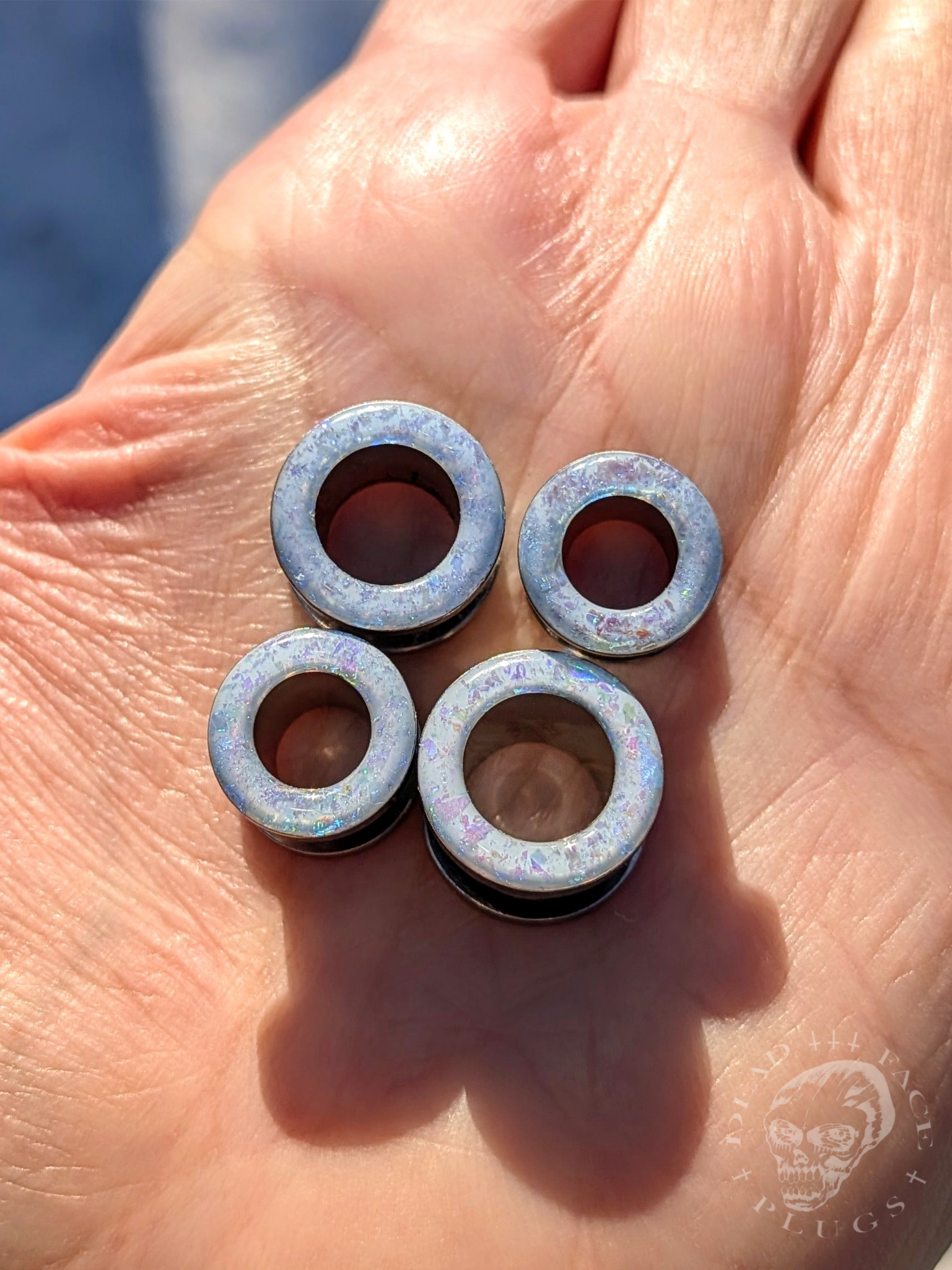 Srebrne tunele do uszu ze stali chirurgicznej z błękitnym zdobieniem i opalizującymi płatkami w odcieniach niebieskiego, turkusowego i zieleni. Zmieniają kolory w zależności od kąta padania światła, tworząc wyjątkowy efekt.