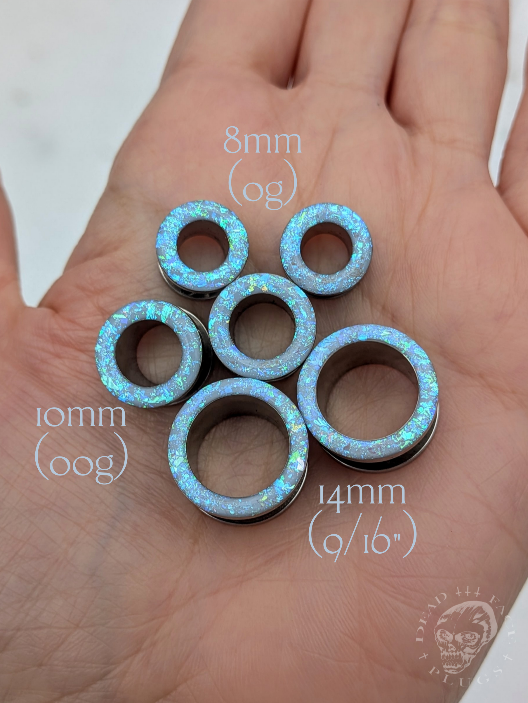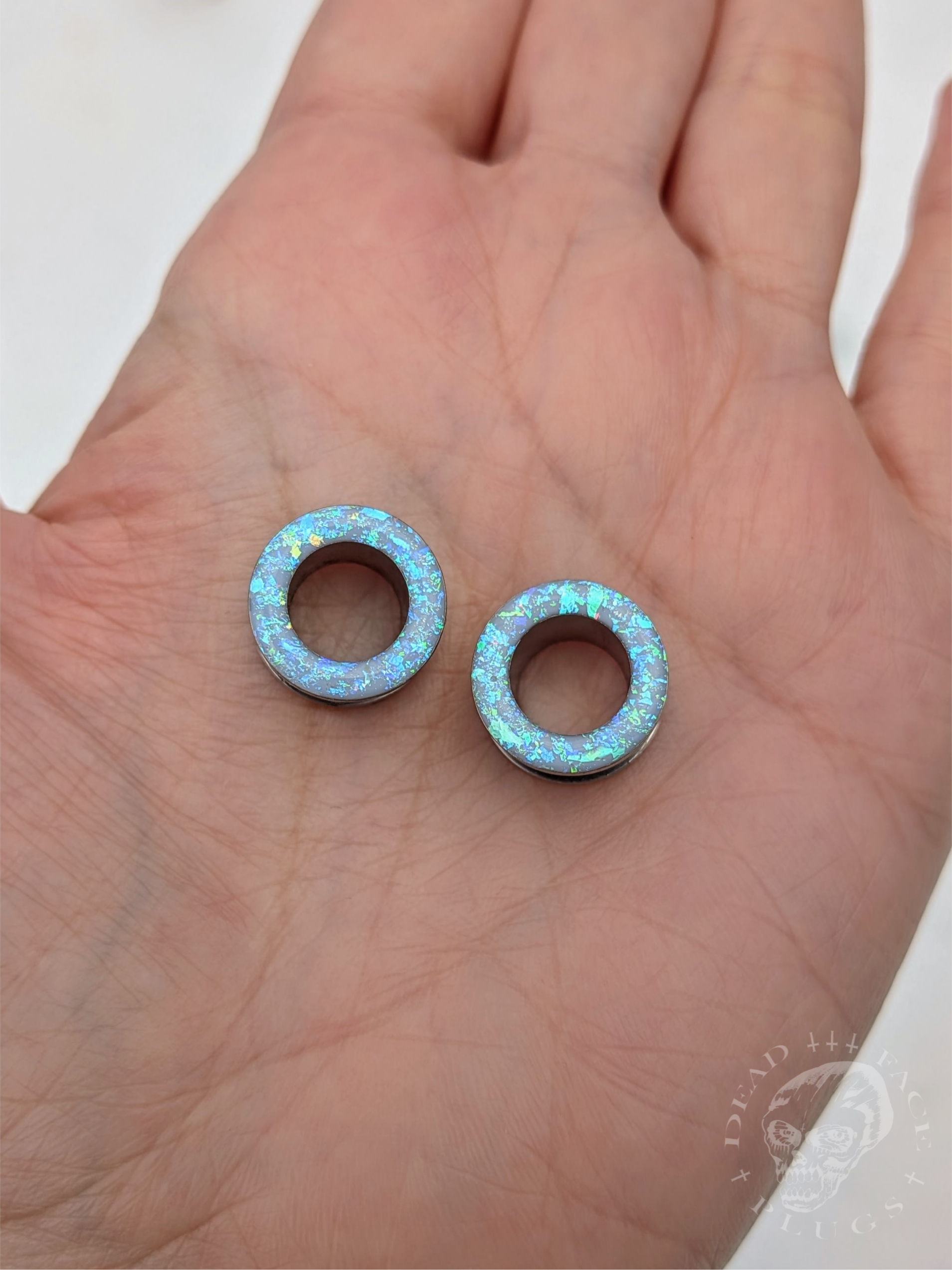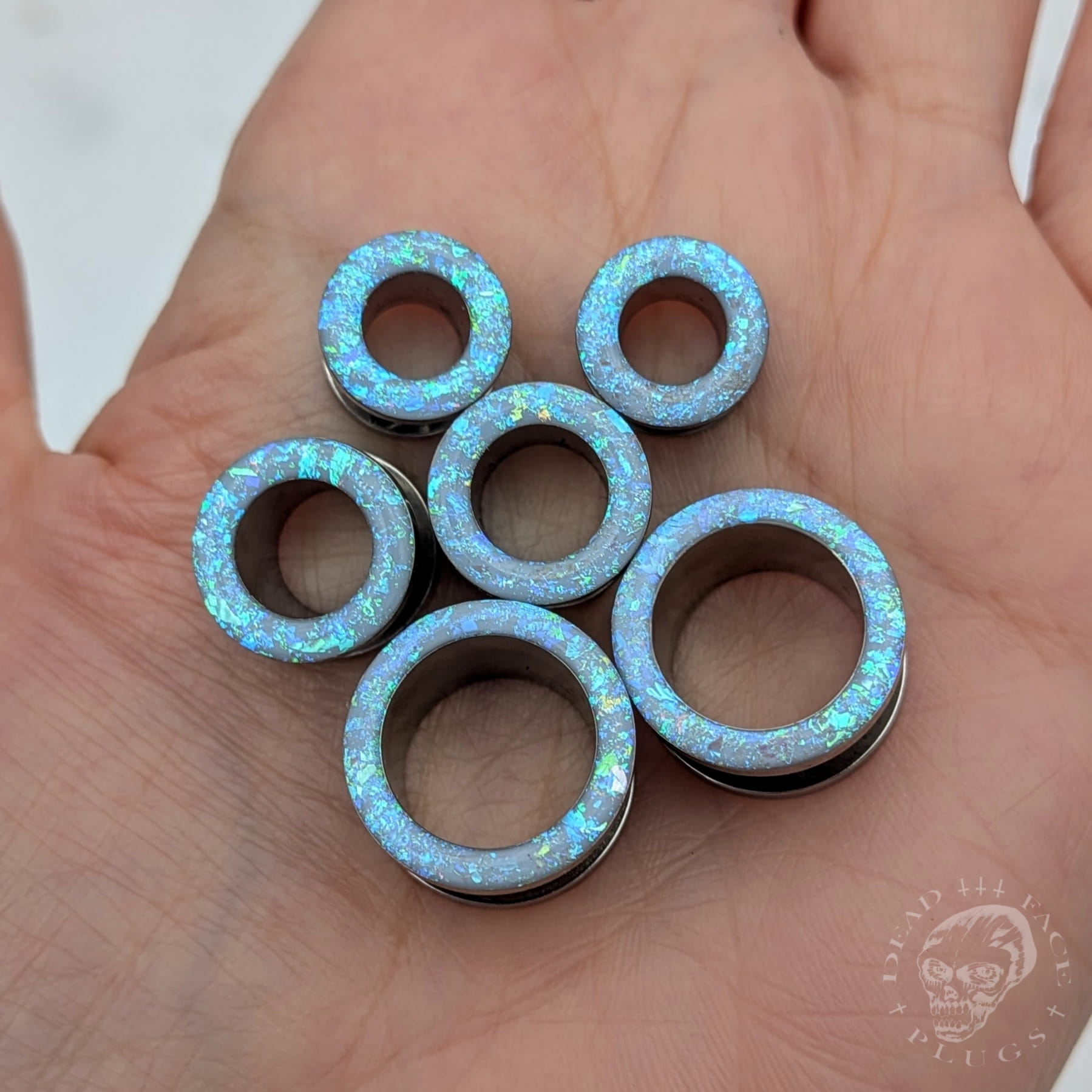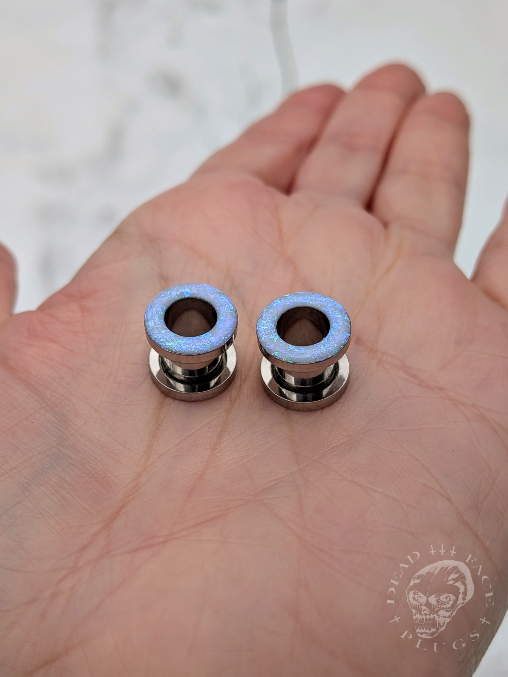 Srebrne tunele do uszu ze stali chirurgicznej z błękitnym zdobieniem i opalizującymi płatkami w odcieniach niebieskiego, turkusowego i zieleni. Zmieniają kolory w zależności od kąta padania światła, tworząc wyjątkowy efekt.