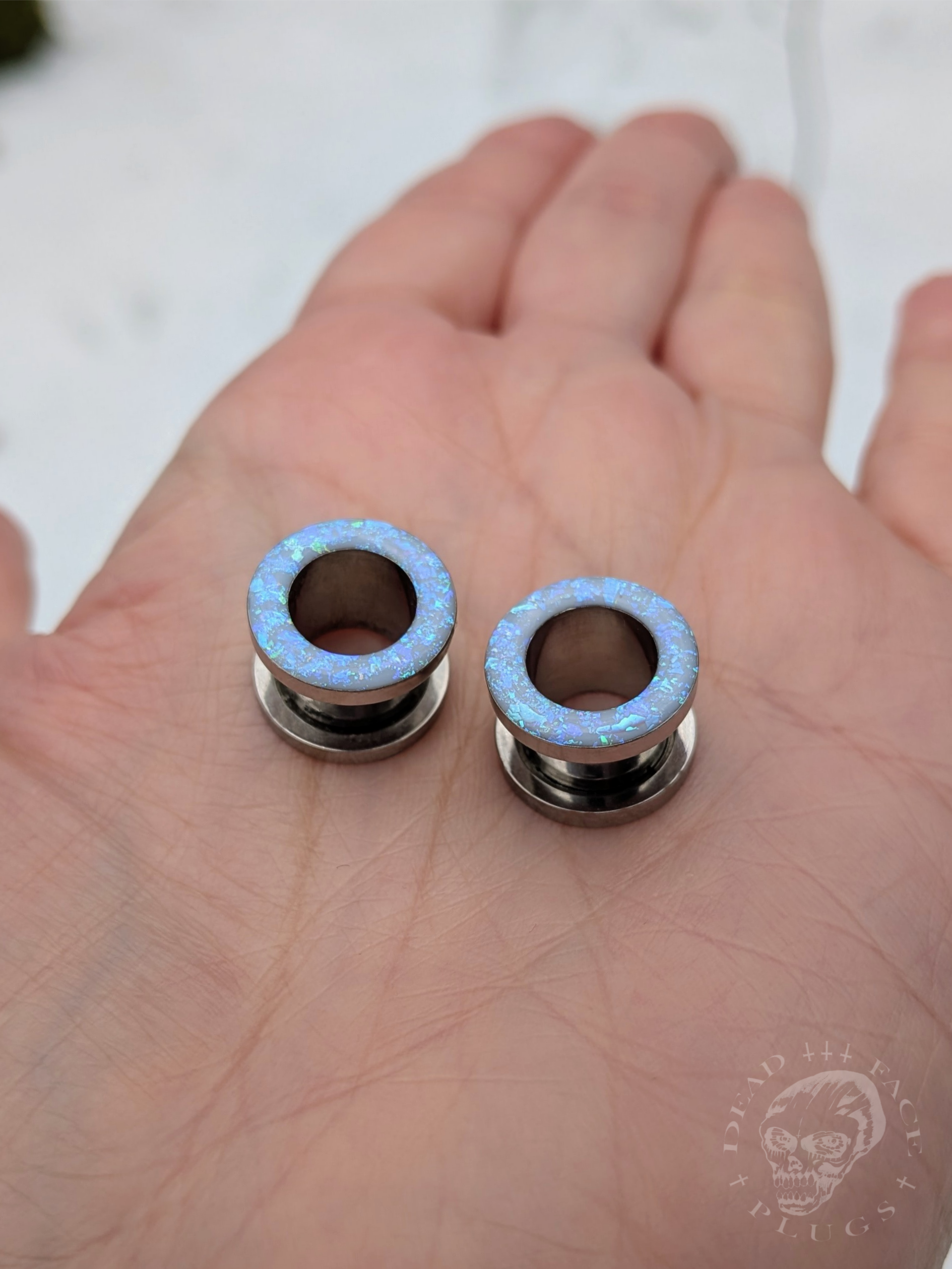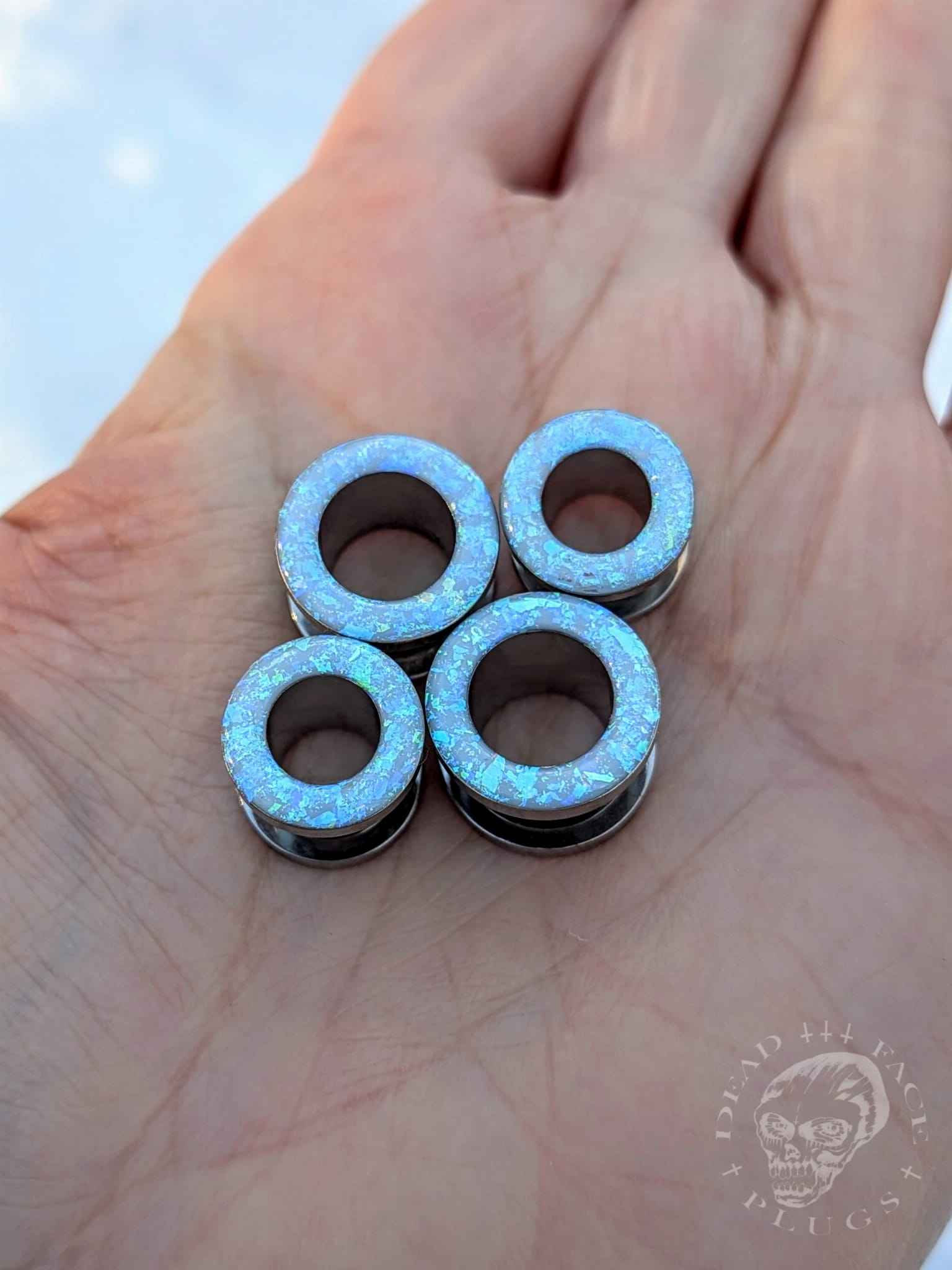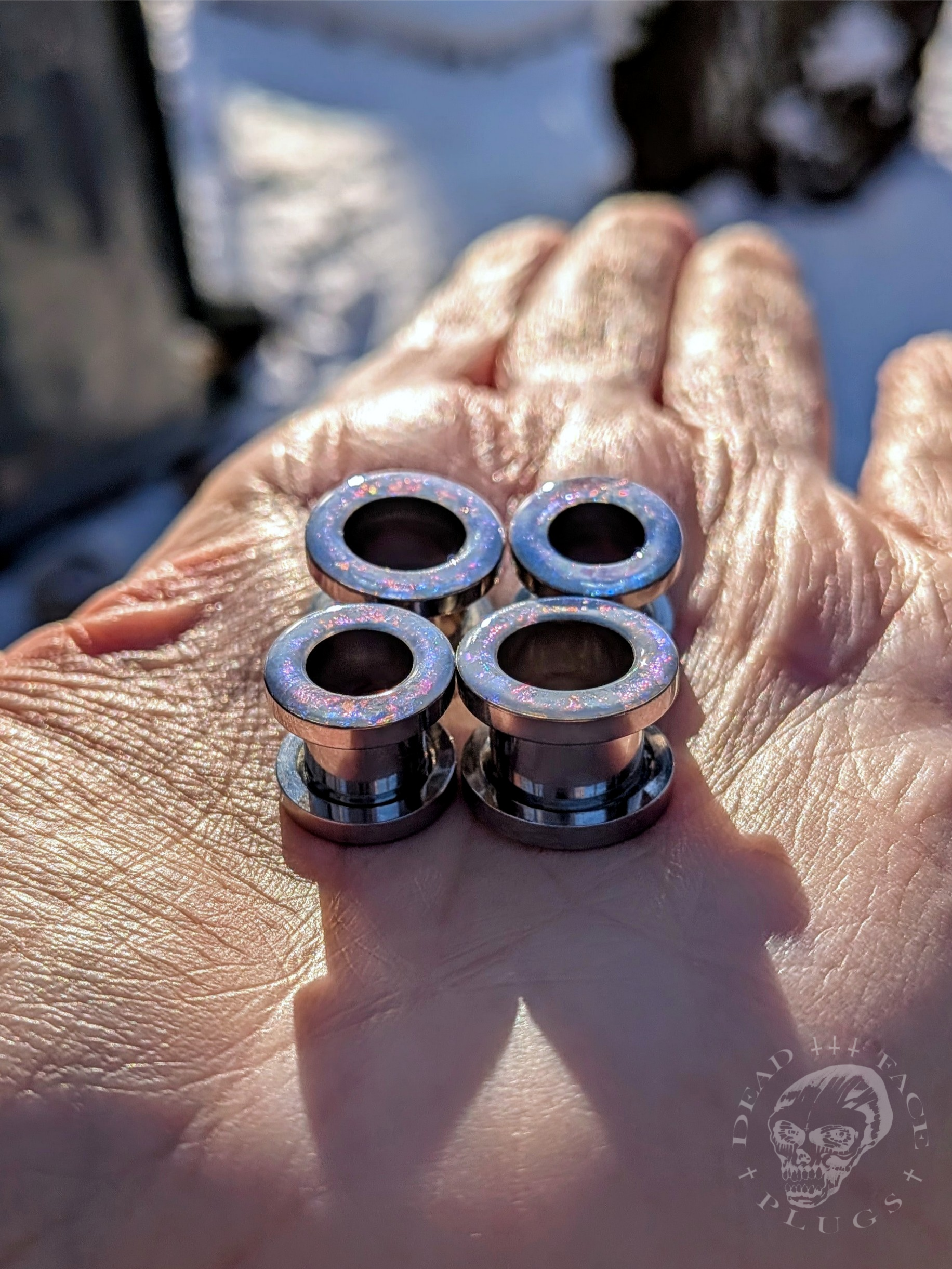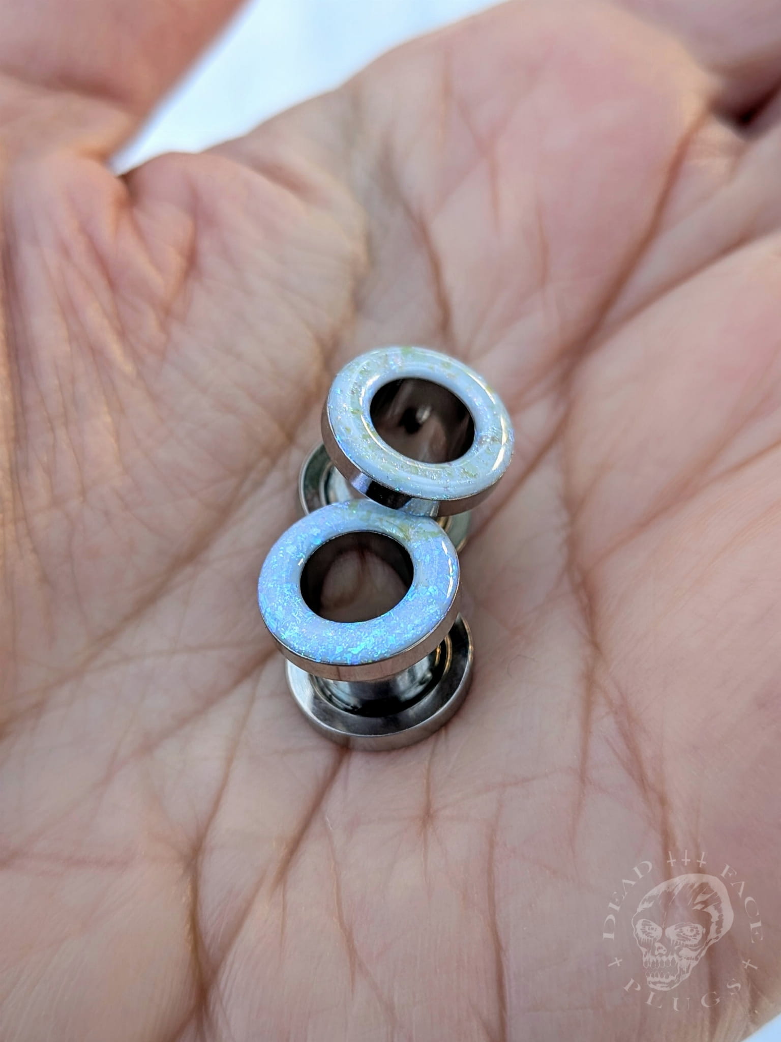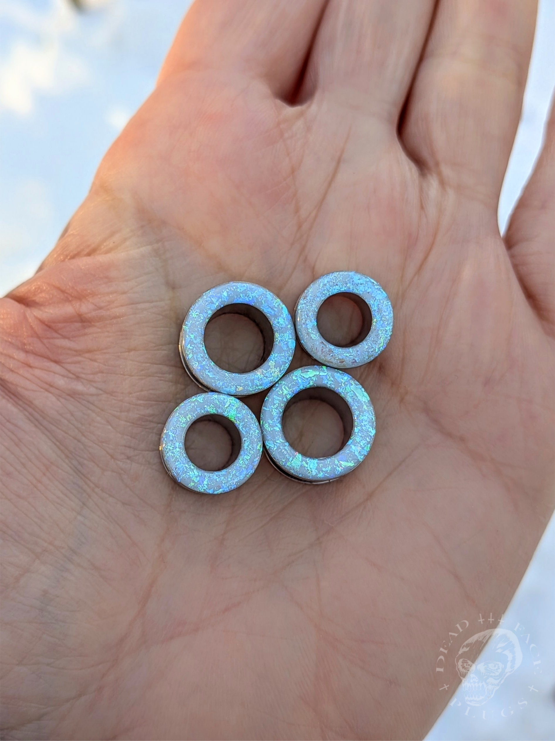 Srebrne tunele do uszu ze stali chirurgicznej z błękitnym zdobieniem i opalizującymi płatkami w odcieniach niebieskiego, turkusowego i zieleni. Zmieniają kolory w zależności od kąta padania światła, tworząc wyjątkowy efekt.