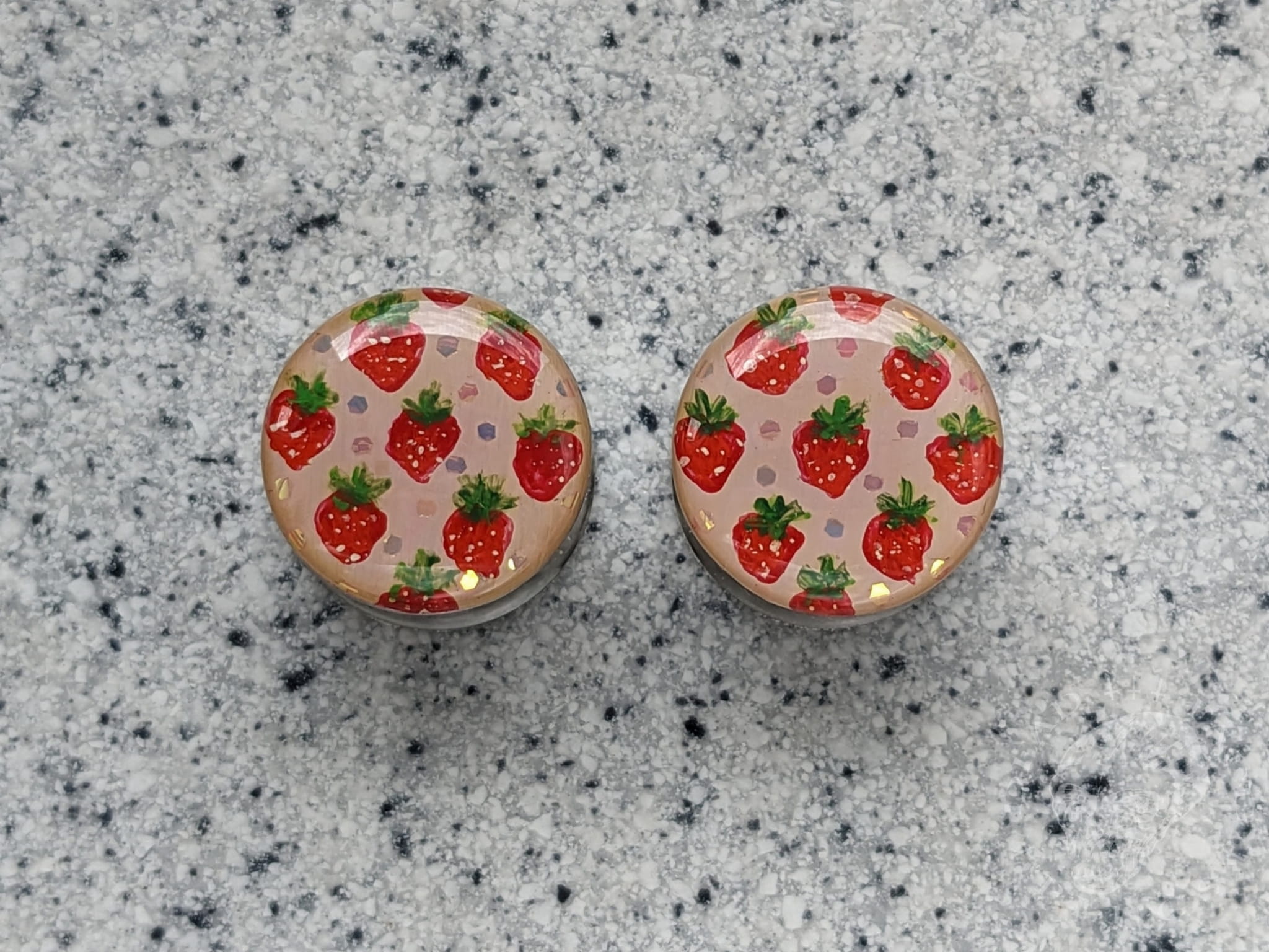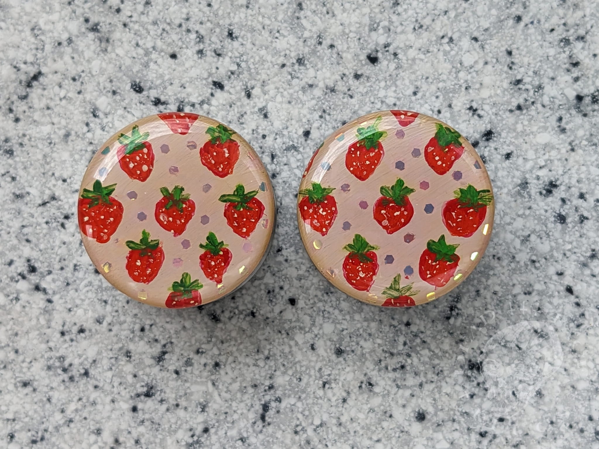 Unique ear plugs crafted on silver stainless steel saddle tunnels, featuring hand-painted juicy strawberries on a dusty pink background. Between the fruits, shimmering rainbow glitter freckles add a magical and playful touch.
