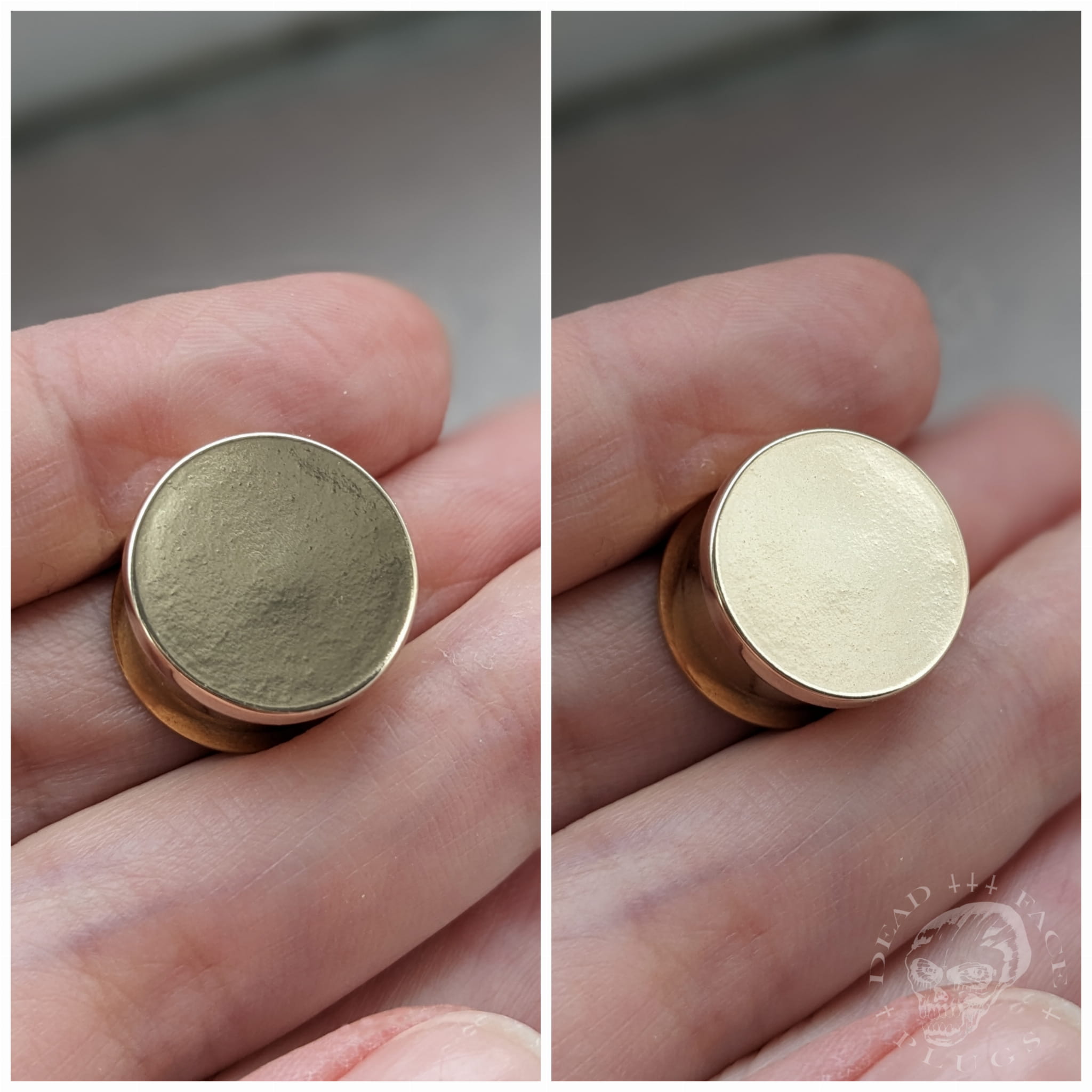 Enhance your unique style with ear plugs crafted on gold stainless steel profiled tunnels, adorned with eye-catching shiny bronze discs with a mirror finish. Every detail is carefully designed to add elegance and a luxurious touch. These plugs are perfect for those who appreciate artistic, alternative jewelry and want to stand out.